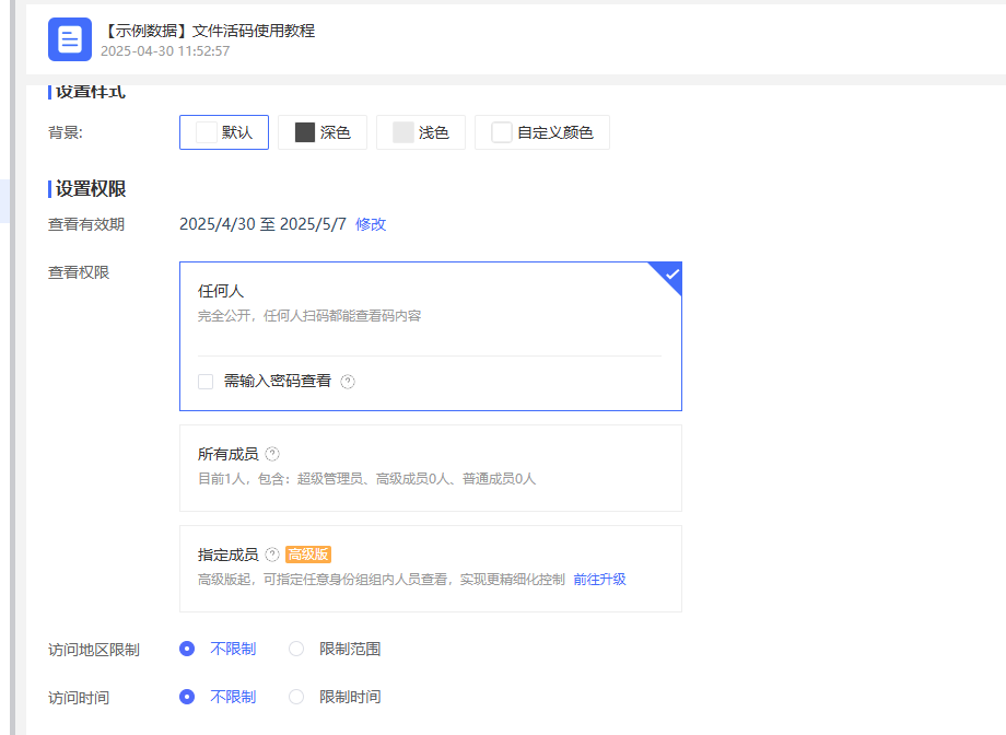 ○ 权限控制:设置访问密码、禁止下载、限制扫码次数。