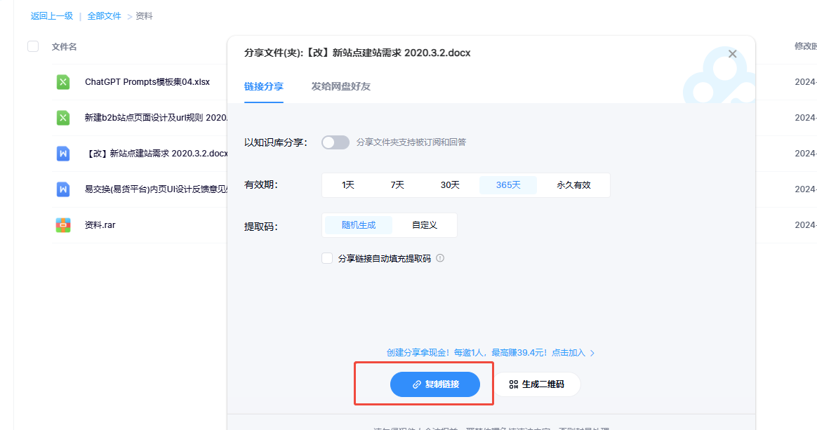- 获取链接:例如生成的链接为 https://pan.baidu.com/s/1ABC123xyz。如图所示: