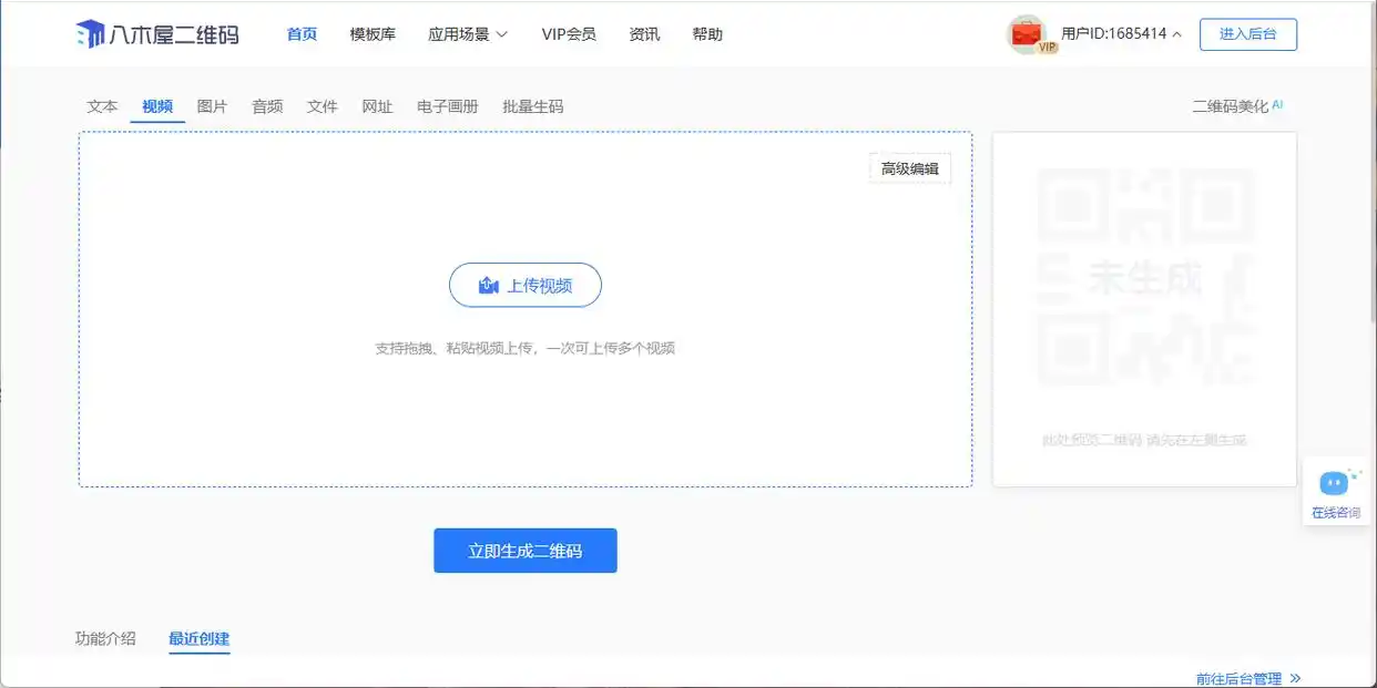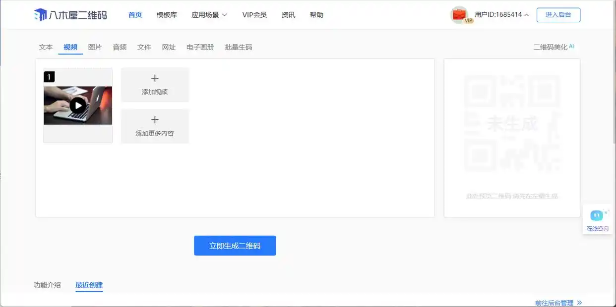 生成二维码:视频上传完成后,点击页面中的“立即生成二维码”按钮,即可将视频转为二维码。