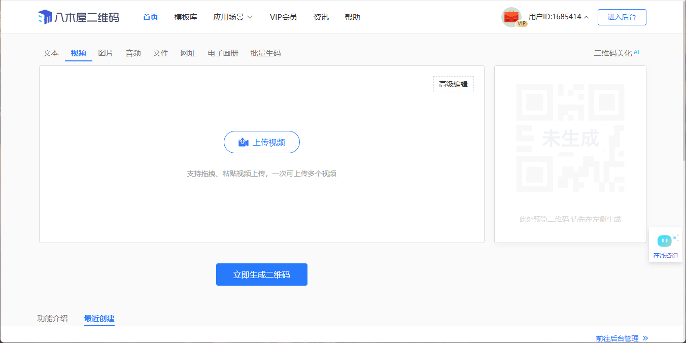 访问平台: 打开您的电脑,输入八木屋二维码,点击左上角的「视频」进入「视频转二维码」功能模块。
