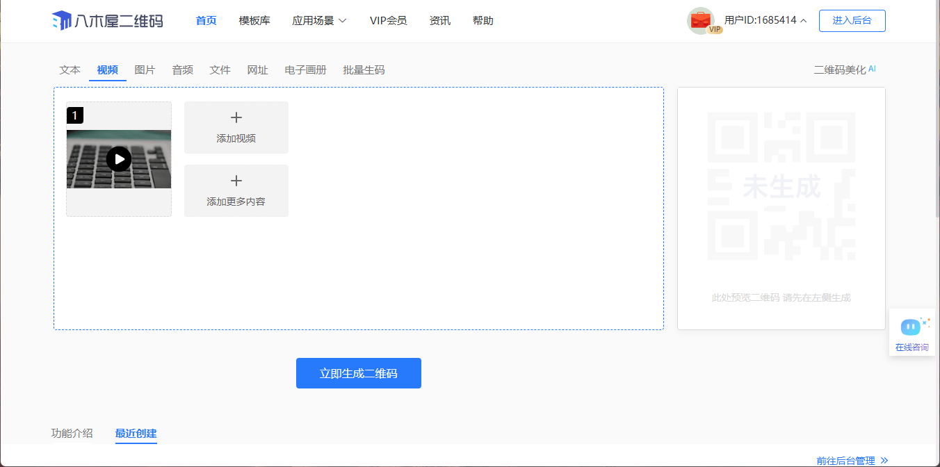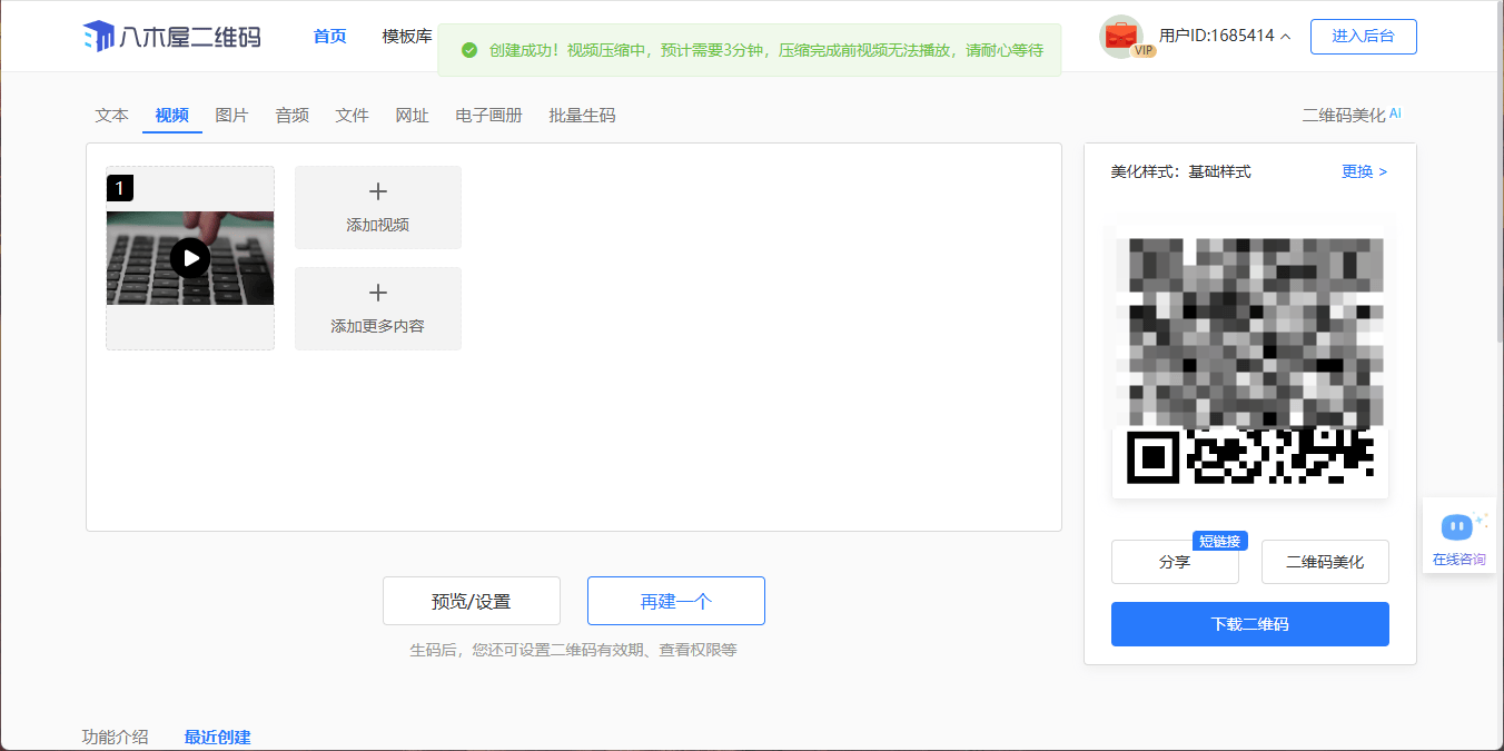 生成二维码: 视频上传并处理完毕后,点击「立即生成二维码」按钮,稍等片刻,二维码就生成好了。八木屋平台会自动进行高效转码,优化视频在不同移动设备上的播放体验,确保手机扫码流畅播放,无需额外压缩。