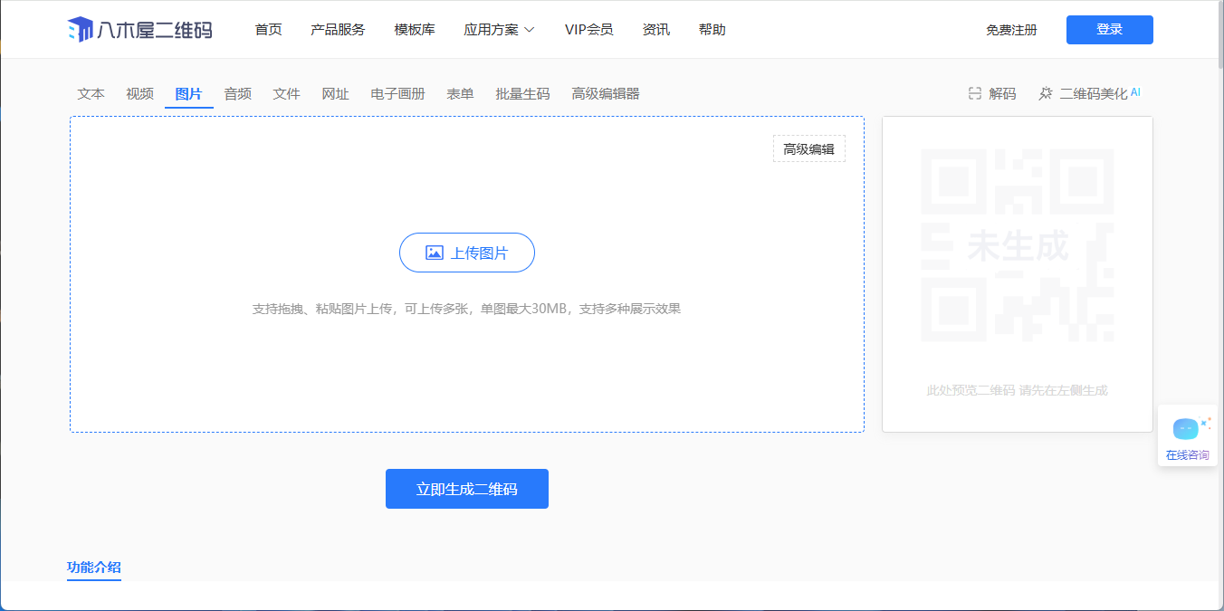 打开支持图片转二维码的在线工具(比如八木屋二维码),找到【图片】功能,点击上传。