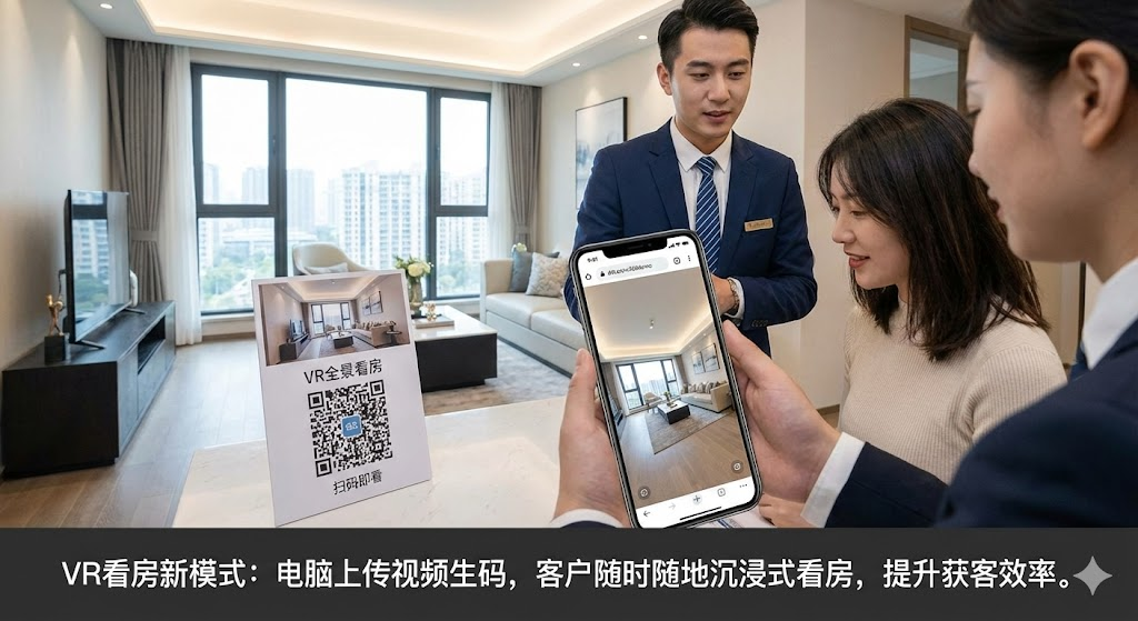 房产中介每天带看多套房源,客户预约时间难协调,异地购房者更是来回奔波成本高。把VR全景视频转成二维码后,客户随时扫码就能720度看房,中介也能把二维码印在楼书、发到朋友圈,获客效率明显提升。